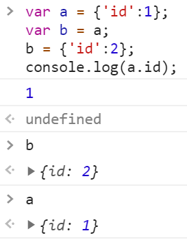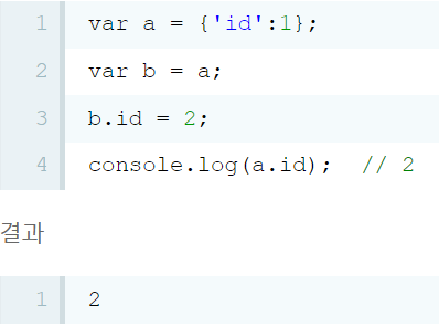놀라운 차이점이 있다. 변수 b에 담긴 객체의 id 값을 2로 변경했을 뿐인데 a.id의 값도 2가 된 것이다. 이것은 변수 b와 변수 a에 담긴 객체가 서로 같다는 것을 의미한다. 참조(reference)의 세계에 온 것을 환영한다.