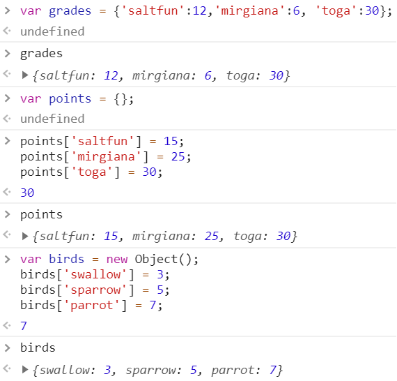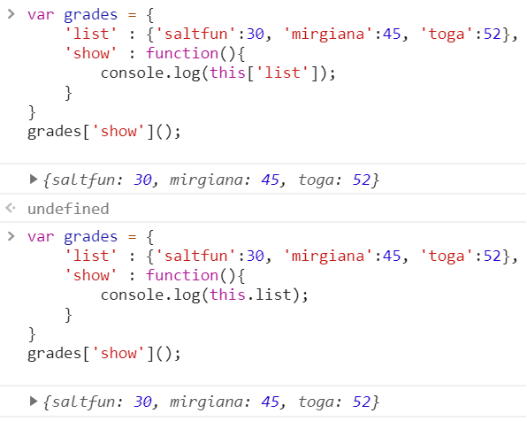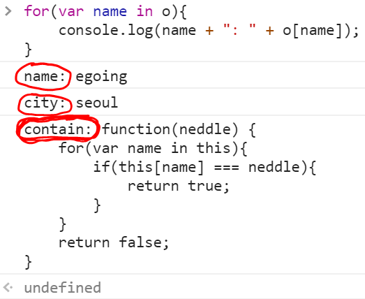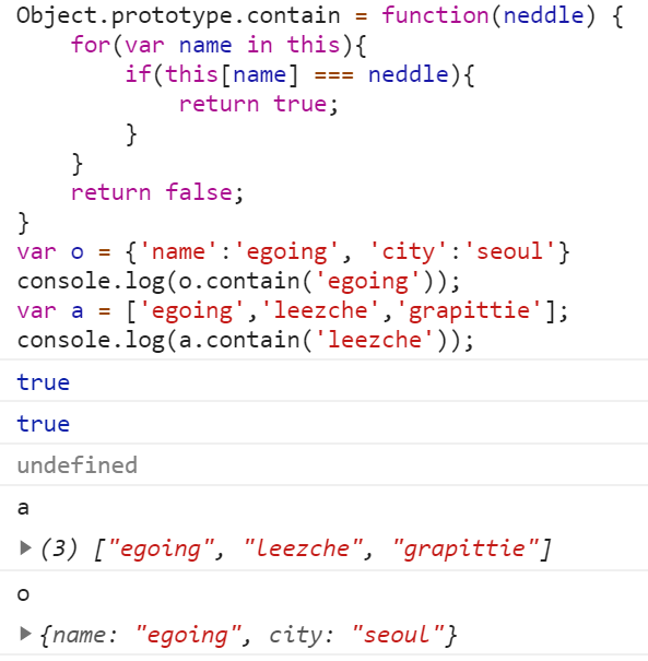 Fig 164 실행 후 바로 Fig 165를 실행하면 객체 o의 값들이 출력되는데 정의한 함수도 나오는 것을 볼 수 있다. Object에만 정의한 줄 알았던 contain이라는 메소드도 포함되어 있는 것, 즉 프로그램 안의 모든 객체에 영향을 주는 것이다.