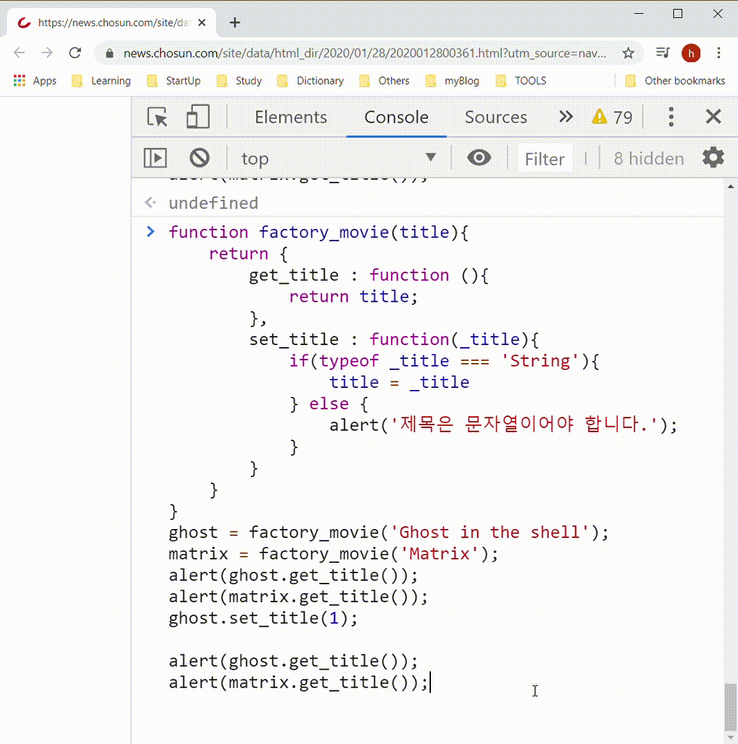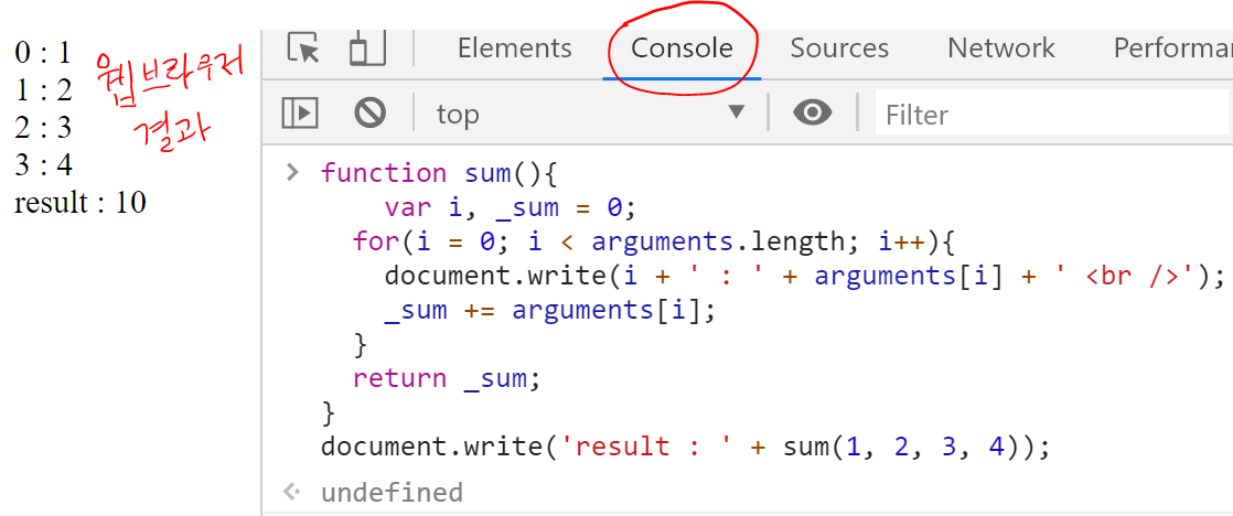 크롬/F12/Console 콘솔창에서 javascript를 직접 실행시킬 수 있다. HTML코드가 전혀 필요없고 순수하게 javascript코드만 작성하면 된다. 명령어를 입력하고 <Enter> 하면 바로 결과를 볼 수 있음. 긴 코드는 파일로 작성하여 작업하는 것이 더 편리하다.
