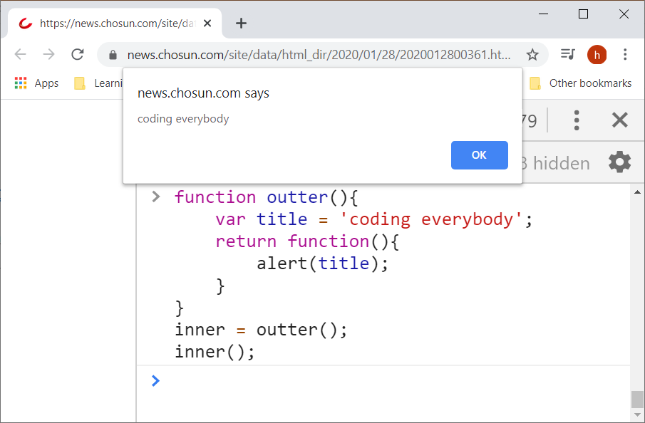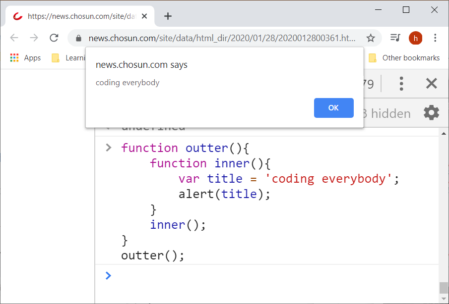 Fig 1의 11 행 대신에 console.log('Hello world'); 를 해주면 alert 와 달리 메세지가 콘솔에 나타난다