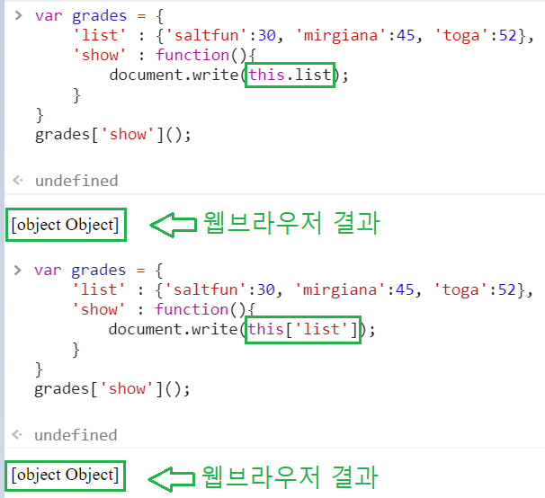 앞에서 설명할 때에는 문자열이 원시 데이터타입이라고 해놓고서는 위의 코드를 보면 문자열은 분명히 프로퍼티와 메소드가 있다. str과 length사이에 있는 점은 Object access Operator 객체 접근 연산자이다. 즉 점을 썼을 때 점 앞에 있는 것은 객체라는 뜻이다. 그렇다면 객체다. 그런데 왜 문자열이 객체가 아니라고 할까? 그것은 내부적으로 문자열이 원시 데이터 타입이고 문자열과 관련된 어떤 작업을 하려고 할 때 자바스크립트는 임시로 문자열 객체를 만들고 사용이 끝나면 제거하기 때문이다. 이러한 처리는 내부적으로 일어난다. 그렇기 때문에 몰라도 된다. 하지만 원시 데이터 타입과 객체는 좀 다른 동작 방법을 가지고 있기 때문에 이들을 분별할 필요가 있다.