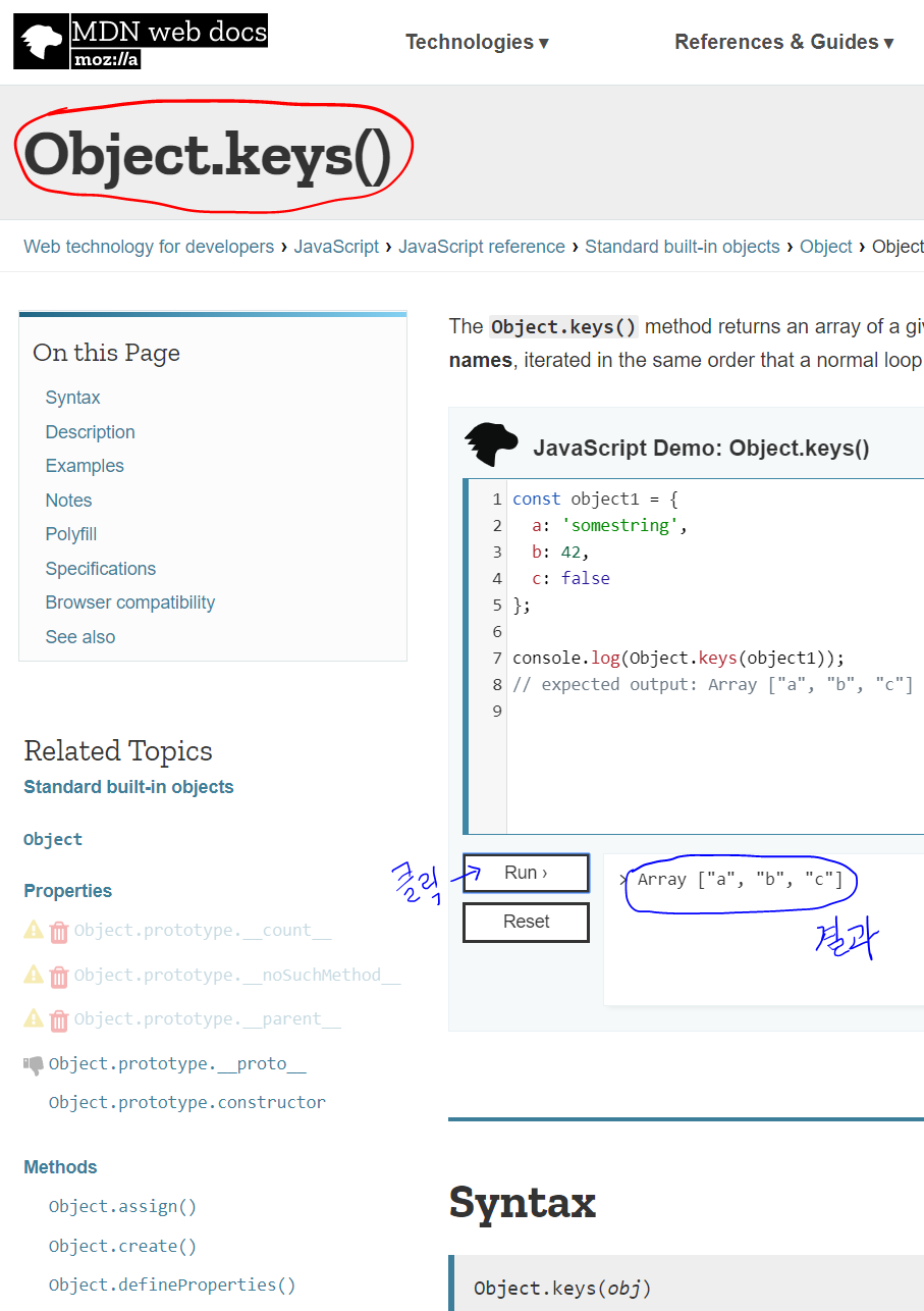 아마도 Object.key는 내부에서 이런 식으로 정의되었을 것이다. Object.keys = function() { ... }