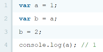 결과는 당연하다. 값을 변경한 것은 변수 b이기 때문에 변수 a에 담겨있는 값은 그대로이다. 변수 b의 값에 변수 a의 값이 복제된 것이다.