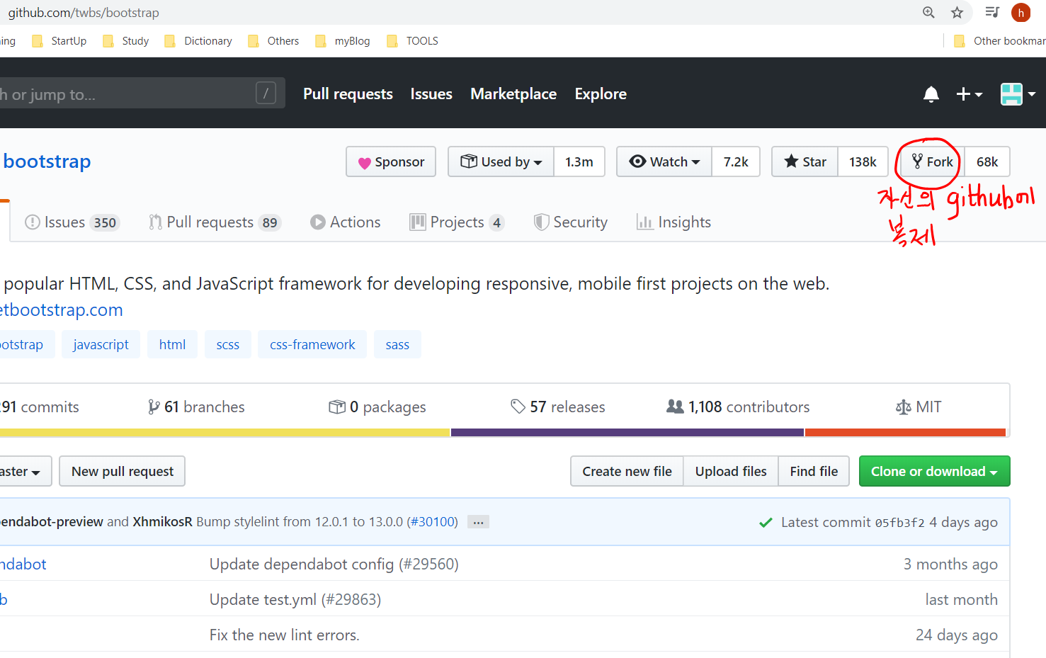 commit이 2020.2.1 현재 19,291회가 되는 twbs/bootstrap 저장소를 한 번 보자.