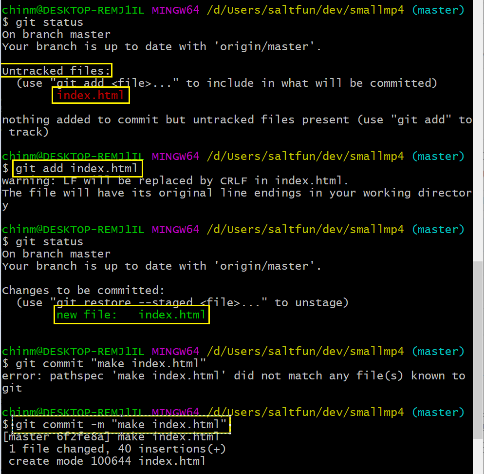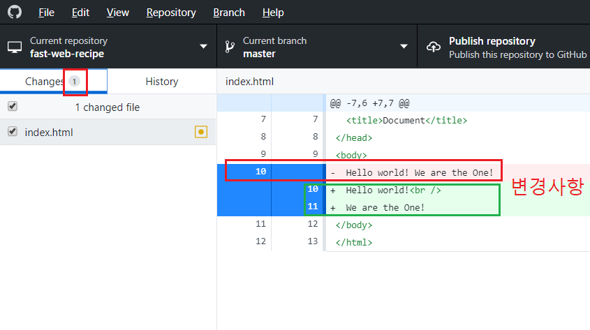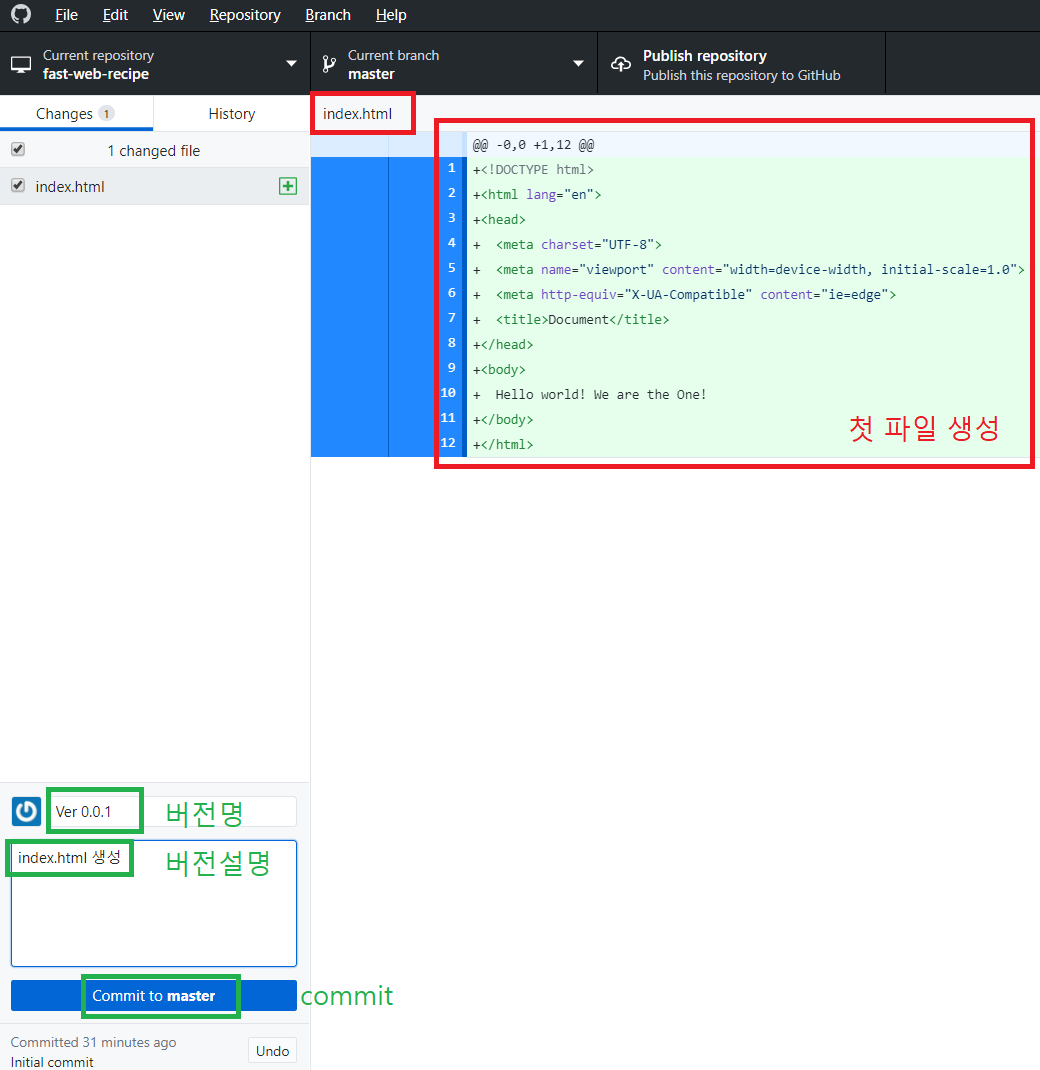 첫 파일 index.html을 만들고 버전을 생성한다.