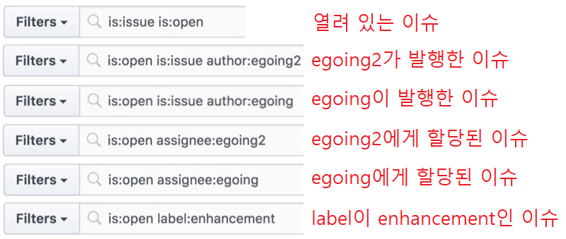 Issues: 각각의 저장소는 여러 가지 issue가 있을 수 있다. 버그가 생겼거나 개선사항이 나타났을 경우 올라오게 되는 각각의 리포트들을 issue라고 한다. 또한 저장소마다 issue를 달 수 있는데 홈페이지의 issue라고 하는 것은 여러 가지 구분되어 있는 issue들을 한 곳에 모아 보여주는 것이다.