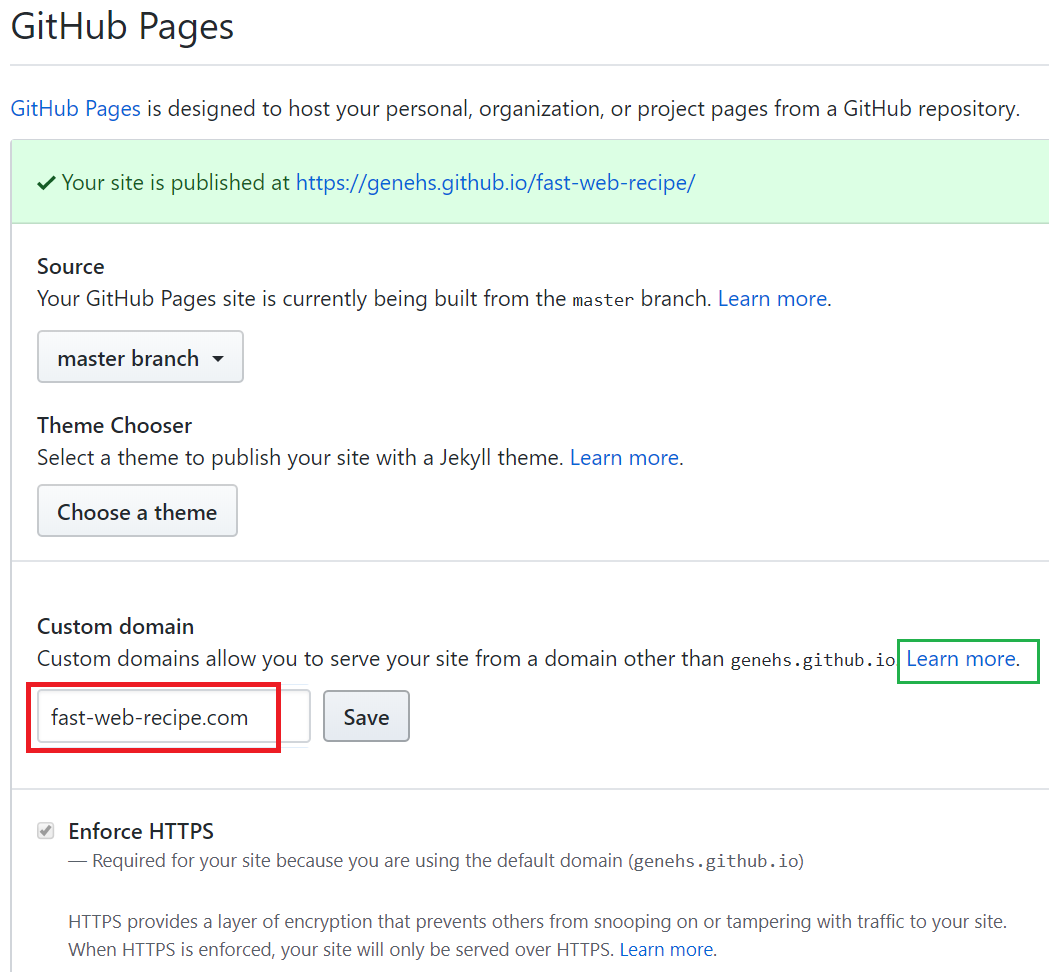 이 설정과 함께, 인터넷사용자가 저 주소를 입력하면 github.com을 찾아오도록 하는 설정도 해주어야 한다. 그 설정을 위해 Learn more 를 클릭하여 정보를 더 봐야 한다.