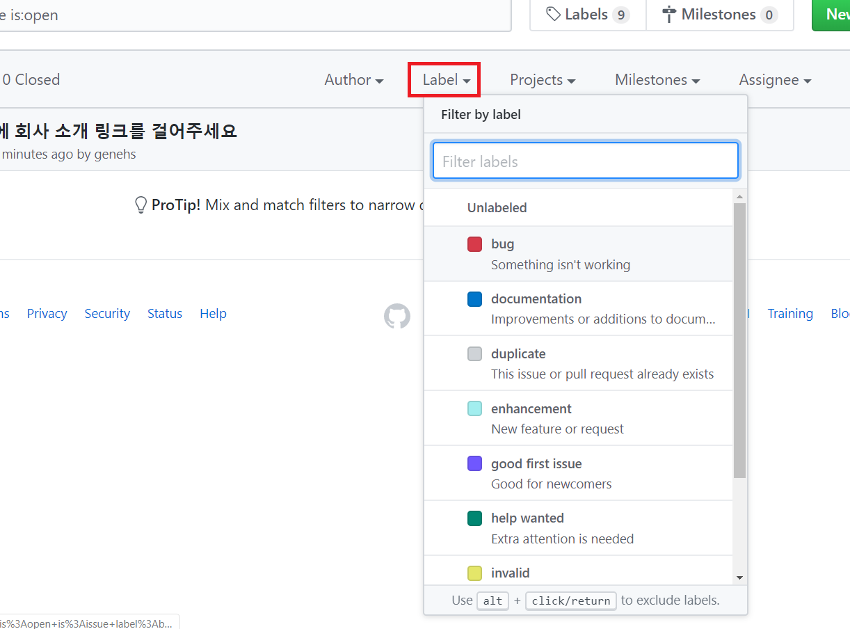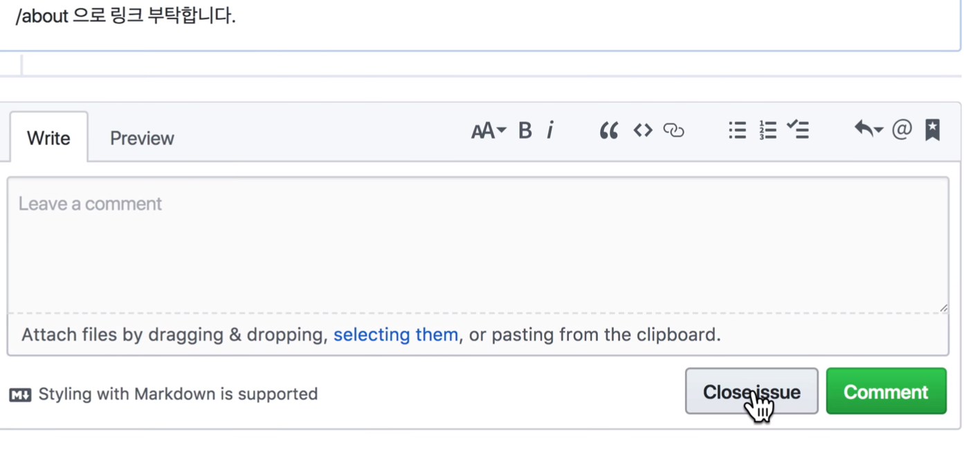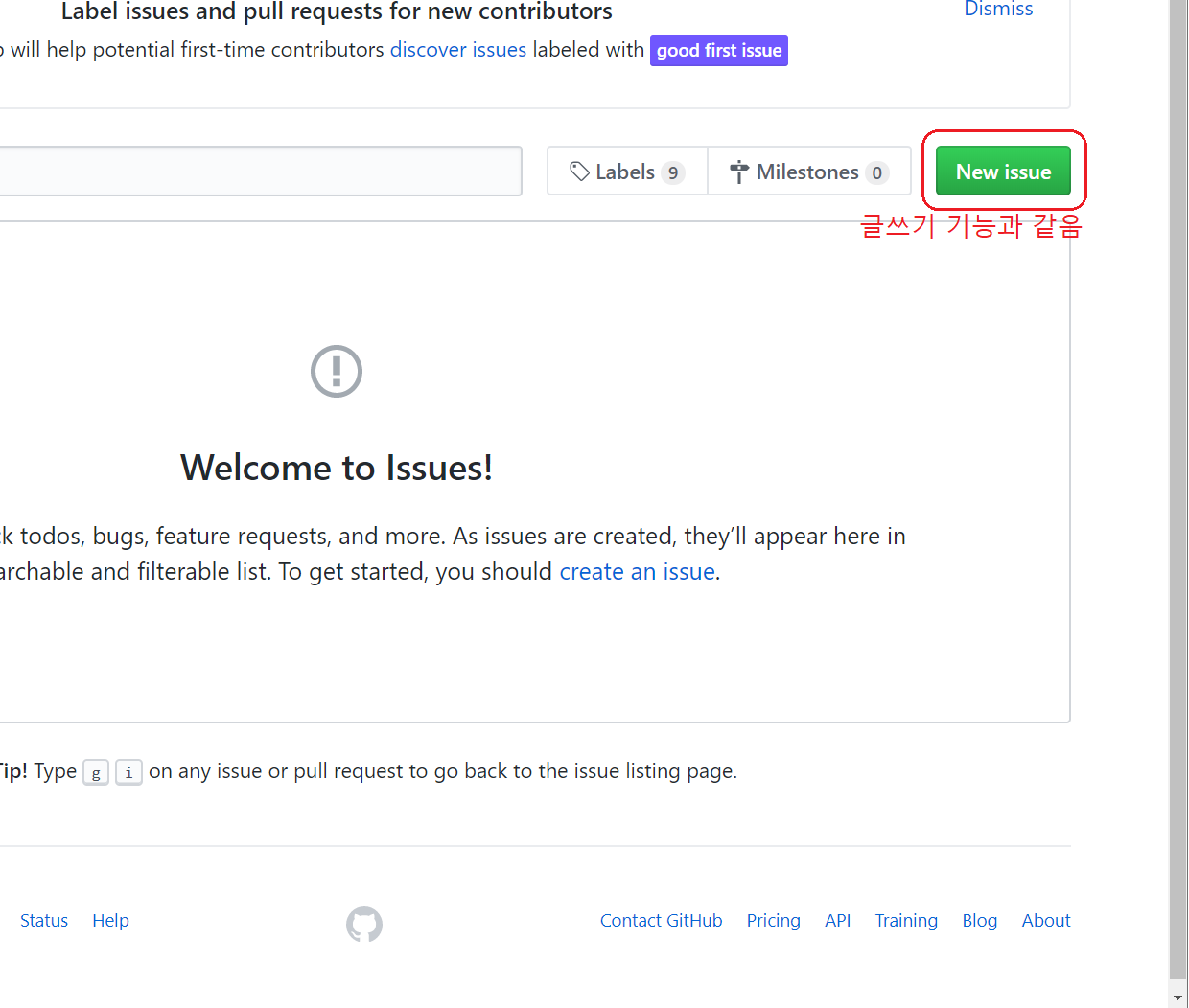 Issuses : 프로젝트를 하다보면 여러 가지 이슈가 발생한다. 버그가 생긴다든지, 개선사항이 있다든지, 요건이 바뀐다든지 등, 이때 사람들과 커뮤니케이션을 할 채널 [게시판 등] 이 필요한데 그런 역할을 하는 것이 issues 이다. New Issue를 클릭하여 새로운 issue를 발행할 수 있다.