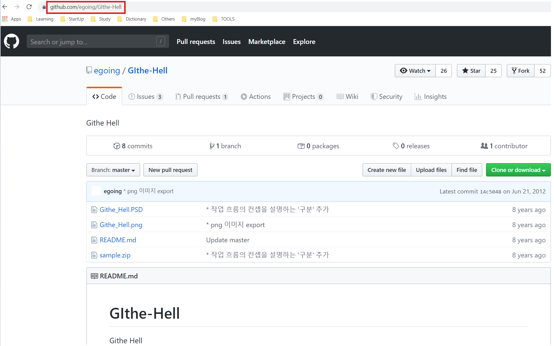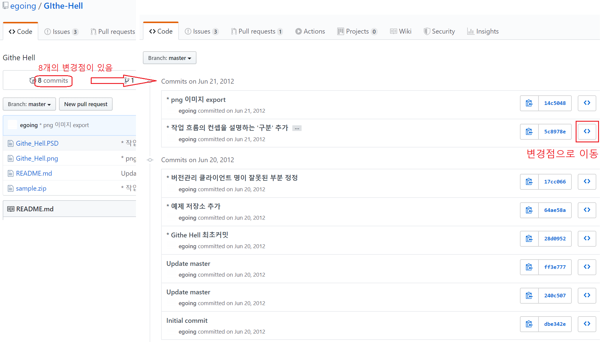 이제 위 그림의 egoing/GIthe-Hell을 클릭하면 해당 저장소로 이동한다.