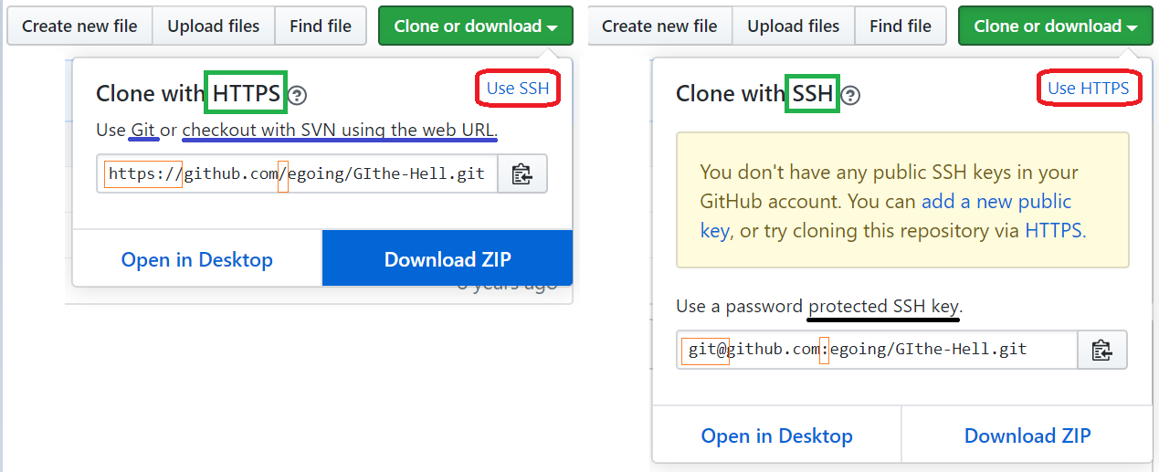 git 클라이언트를 이용하여 파일을 다운로드 받아 로컬에서 작업하거나 동기화하려고 할 때 사용할 수 있는 URL의 종류가 HTTPS, SSH의 2 가지가 있으며 약간 차이가 있는 것을 알 수 있다. 또한 권한에 따라 프로젝트를 수정할 수도 있고 그냥 다운받아 사용만 할 수도 있다.