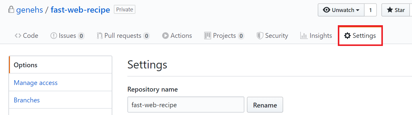 Settings 탭을 열고 현재 repository의 상태가 private이면 유료인데, 무료를 원한다면 public으로 상태를 전환해야 한다.