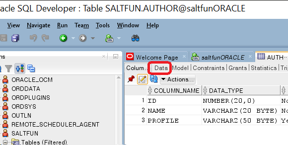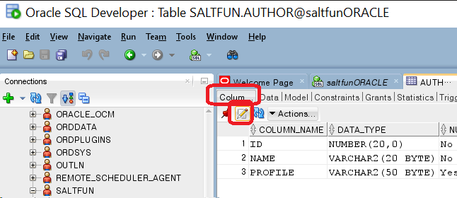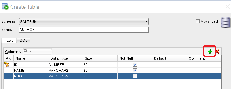 SQL Developer에서 테이블 추가. 일단 위의 예시를 실습을 통해 한 번 해보자. author라는 테이블을 먼저 만든다.