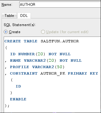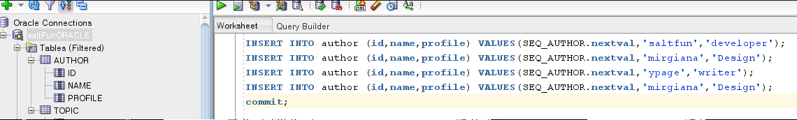 INSERT INTO author (id, name, profile) VALUES(SEQ_AUTHOR.nextval, 'saltfun', 'developer');