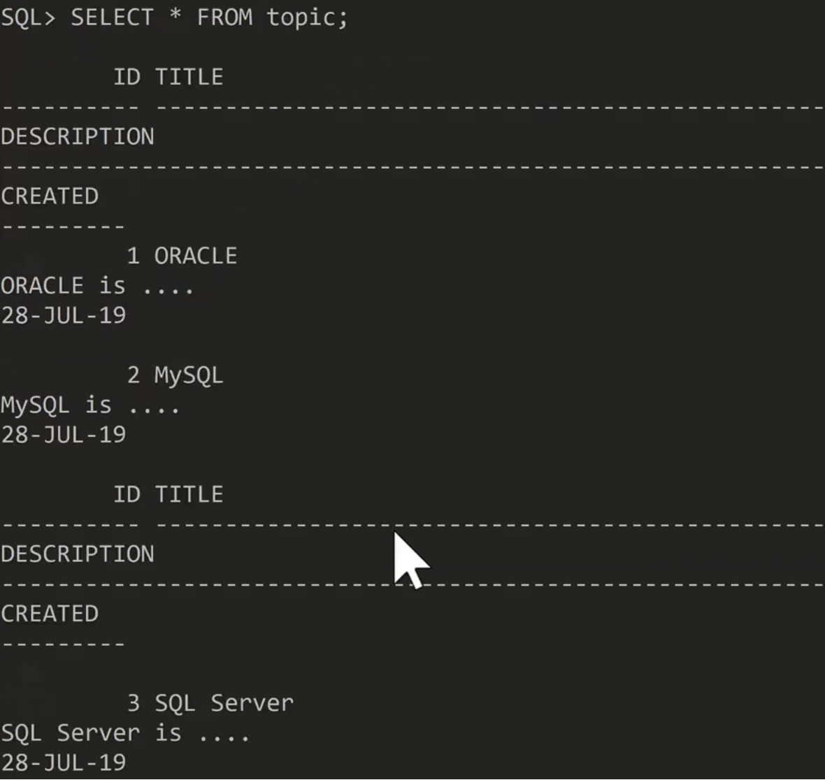 SELECT * FROM topic; topic 테이블의 모든 컬럼의 값[ * ]