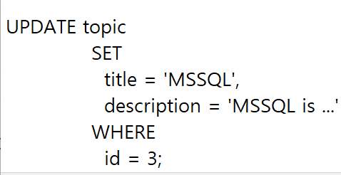 DELETE FROM topic WHERE id=3; id 열값이 3인 행을 삭제 [뒤에는 반드시 commit; 실행]