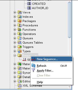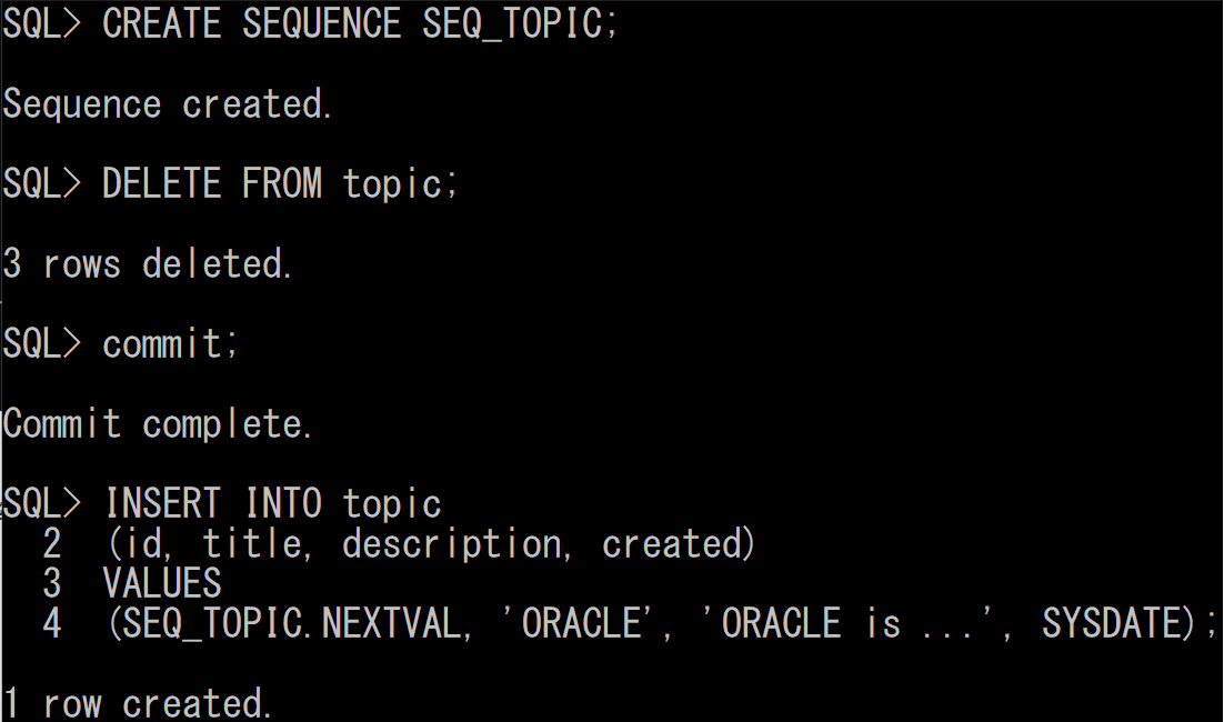SQL> CREATE SEQUENCE SEQ_TOPIC; SEQ_TOPIC : 생성하려는 sequence 의 이름을 달아줌